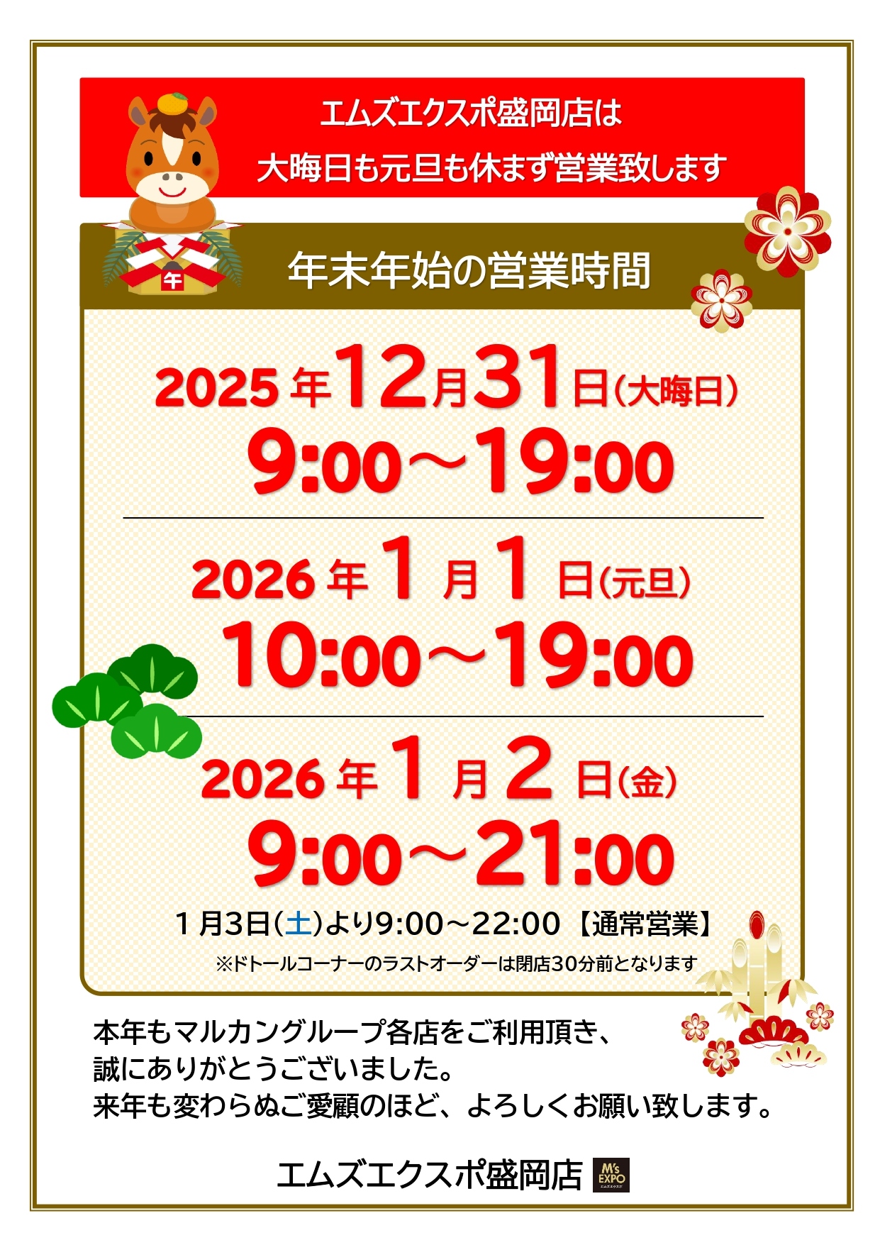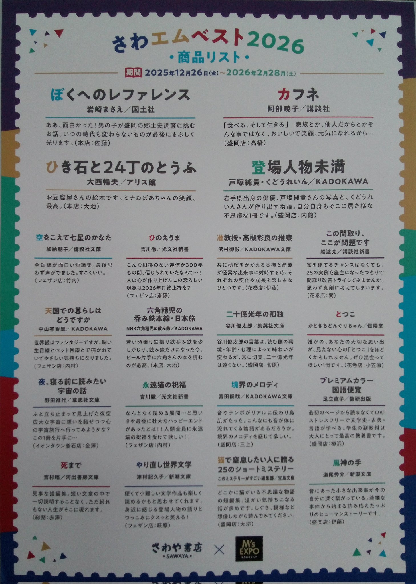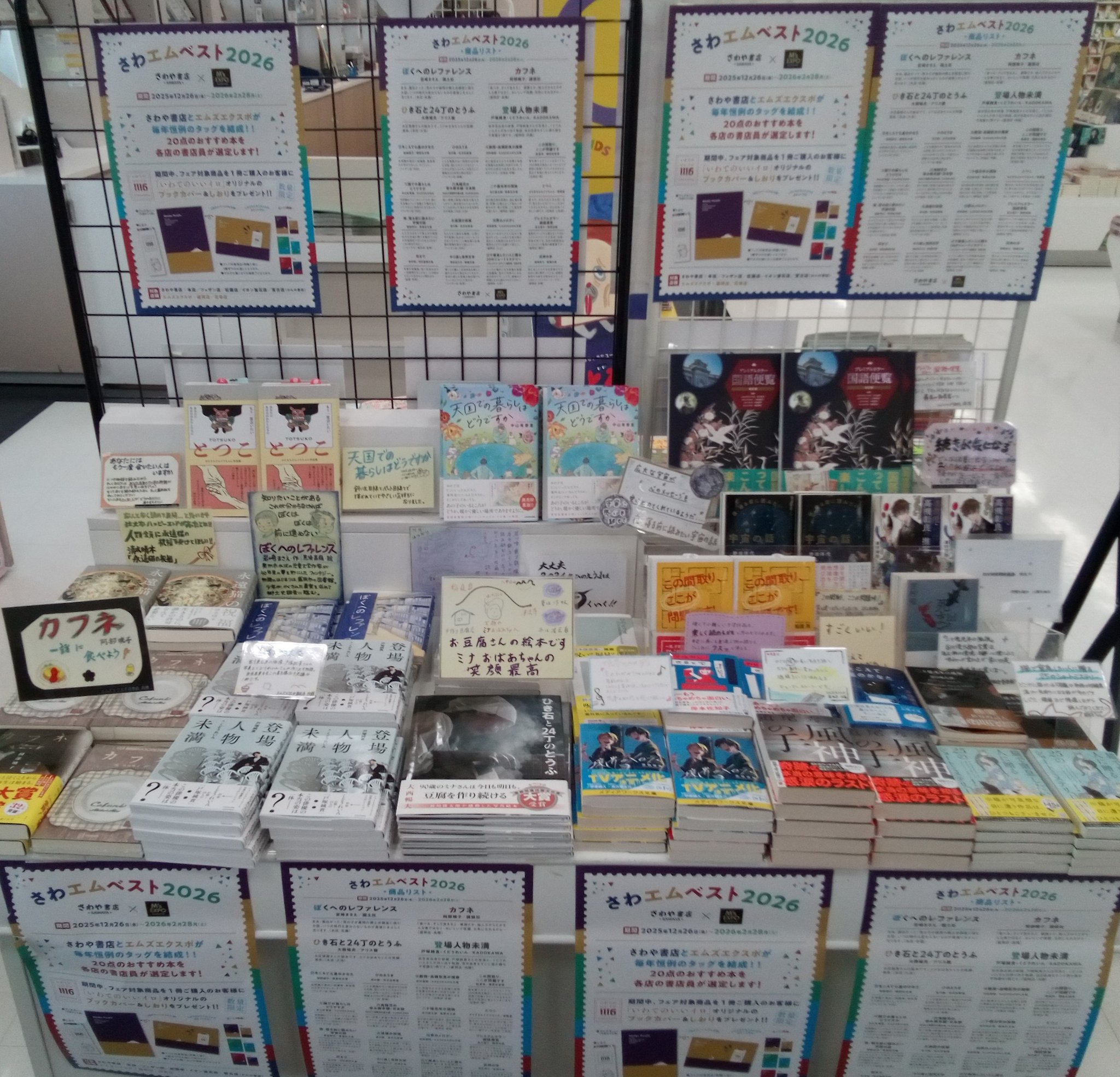 HOME 新着情報 2026.1.13 エムズエクスポ盛岡店 / ミュージックコーナー 幾田りら ニュー・アルバム発売 幾田りら、約3年ぶりの集大成ニュー・アルバム『#Laugh』発売されました。映画・アニメ・ドラマ主題歌から今作のために書き下ろされた新曲まで——挑戦と進化が詰まった全13曲。さらに初回盤には豪華コラボ&カバー17曲+36Pフォトブック📸これは見逃せない…! 2026.1.8 エムズエクスポ盛岡店 / 書籍コーナー 一生どうでしょうします! 『水曜どうでしょう DVDコレクション』好評販売中!豪華特典映像が収録されたファン垂涎のシリーズがとうとう発売です♪雑誌コーナーとレジ前話題書コーナーで大きく展開中!番組ファンの雑誌担当が手掛けた売場を是非お楽しみください!ご来店お待ちしております 2026.1.7 メガチャンス花巻店 / お知らせ 冬物最終SALE & 買取キャンペーン メガチャンス花巻店では冬物衣料品セールを開催中です。コートやジャケットなどの冬物衣料品が最大50%OFFとたいへんお買い得です。また、春物衣料品の買取を強化しております。まだまだ冬物も買取します!!季節を問わず買取しておりますので、まとめてお持ちください。今月は、楽器・カメラ・オーディオの買取20%UPキャンペーン中です。この機会にお持ちください。大量の場合は出張買取もいたしますのでご相談ください。ご来店お待ちしております。 2026.1.5 エムズエクスポ花巻店 / お知らせ 冬休みイベント開催のおしらせ 1/6からイベント開催です♪昨年もイベントにたくさんの方々にご参加いただきありがとうございます。今年もたくさんのイベントを開催予定です。たくさんのご参加お待ちしております! 2026.1.1 エムズエクスポ盛岡店 / お知らせ 謹賀新年 あけましておめでとうございます。昨年もマルカングループ各店をご利用いただき誠にありがとうございました。本年も更なるサービス向上に努めて参りますので今後ともご愛顧を賜りますようお願い申し上げます。皆様のご来店をスタッフ一同心よりおまち申し上げております。 2025.12.28 エムズエクスポ盛岡店 / 書籍コーナー さわエムベスト2026開催中! 恒例!『さわエムベスト』 開催中です😊期間:2025年12月26日(金) から 2026年2月28日(土)までさわや書店さんとエムズエクスポのスタッフが熱く推す20点のおすすめ本をご用意しました!期間中、フェア対象商品を1冊ご購入のお客さまへ「いいイロにっぽん」コラボしおり&カバー(文庫サイズ)を数量限定で差し上げておりますご来店お待ちしております! 2025.12.22 エムズエクスポ盛岡店 / 書籍コーナー 『くもんの知育玩具』 体験会のおしらせ 大人気!くもんの知育玩具「KUMON TOY」の体験会を行います‼楽しく遊びながら学べるようにつくられた「くもんの知育玩具」「お子さまが自ら学べ、力がつく」ノウハウを基礎に、夢中になってくり返し遊びたくなる楽しさなどが体験できます〇日時:2026年1月11日(日) 11:00~16:00〇場所:エムズエクスポ盛岡店 書籍コーナー無料でご参加いただけますので、みなさま是非お立ち寄りください🧒※参加者には「おみやげ」をプレゼントします! 2025.12.19 エムズエクスポ盛岡店 / お知らせ 年末年始営業時間のご案内 いつもエムズエクスポ盛岡店をご利用いただきありがとうございます。誠に勝手ながら、年末年始は下記内容に営業時間を変更いたします。お客様にはご不便をおかけ致しますが、何卒よろしくお願い申しあげます。 2025.12.15 エムズエクスポ盛岡店 / 書籍コーナー 瀬尾まいこ先生がご来店されました! 瀬尾まいこ先生にご来店いただきました。いつも書店を応援してくださるそのお姿に感服です。この寒空の下、Tシャツ姿も凛々しいです。サイン本も作成していただきました。水鈴社『ありか』心揺さぶる熱い作品で、間違いなくオススメです。 2025.12.15 エムズエクスポ盛岡店 / 書籍コーナー オススメ新刊情報! 『Evolving〈進化〉 大谷翔平2025 岩手日報特別報道記録集』好評発売中!投手としても打者としても歴史的な活躍となった2025年をまとめた一冊。是非お手にとってご覧ください。書籍入口付近 特設スペースにて展開中です!ご来店お待ちしております! 92件中 1 - 10件の項目を表示|<< <12345678910>>>| Store List エムズエクスポ盛岡店 アルテマルカン桜台店 エムズエクスポ花巻店 ドトール アルテマルカン桜台店 トイエムズ 桜台店 メガチャンス 花巻店 太陽光発電事業部 JOYFIT24LITE花巻店 エムウォッシュ FIT365弘前城東 ドトール アルテマルカン桜台店 FIT365水沢 FIT365北上 New Entrys 2026.01.13 エムズエクスポ盛岡店 幾田りら ニュー・アルバム発売 2026.01.08 エムズエクスポ盛岡店 一生どうでしょうします! 2026.01.07 メガチャンス花巻店 冬物最終SALE & 買取キャンペーン 2026.01.05 エムズエクスポ花巻店 冬休みイベント開催のおしらせ 2026.01.01 エムズエクスポ盛岡店 謹賀新年 2025.12.28 エムズエクスポ盛岡店 さわエムベスト2026開催中! 2025.12.22 エムズエクスポ盛岡店 『くもんの知育玩具』 体験会のおしらせ 2025.12.19 エムズエクスポ盛