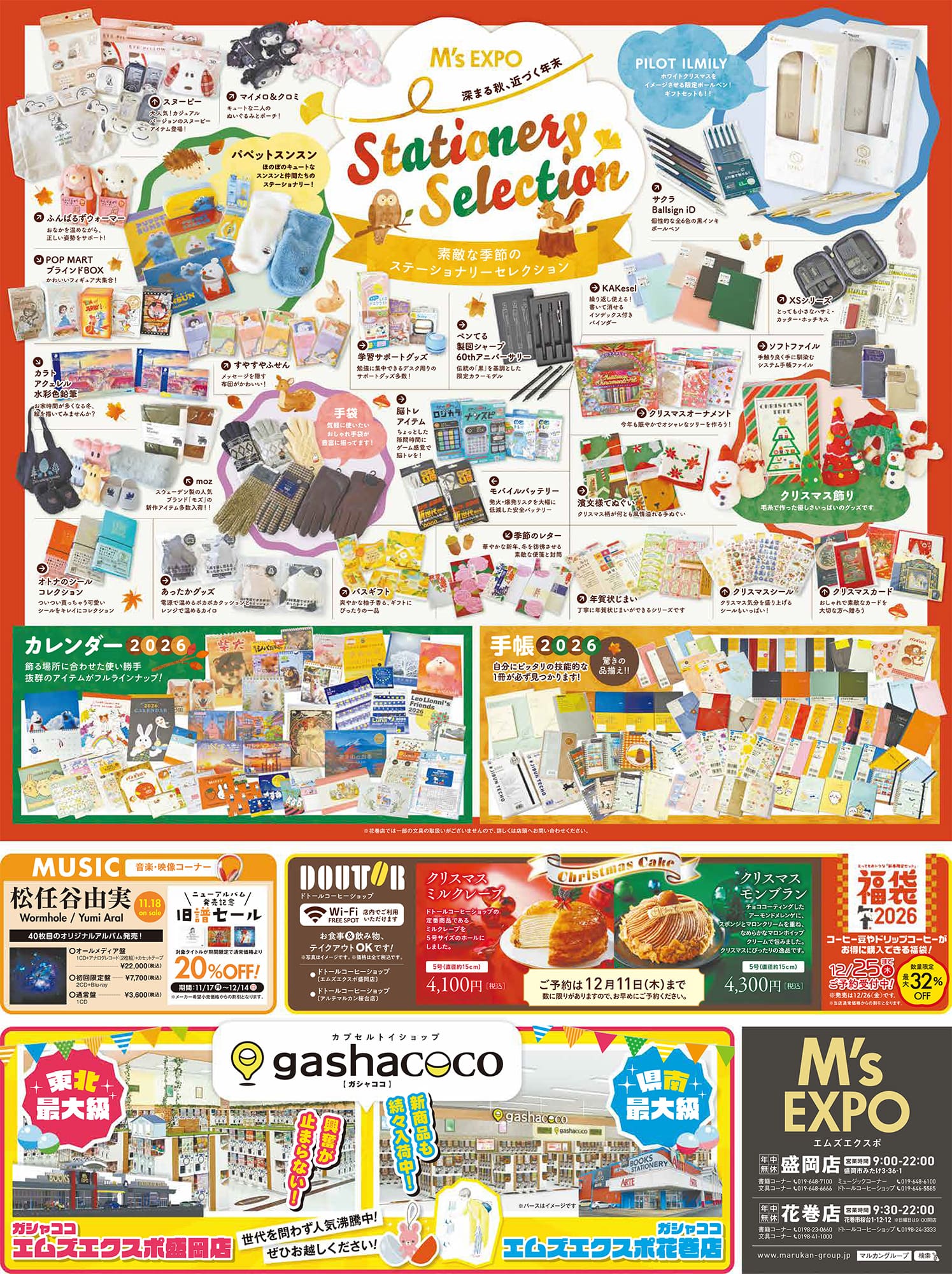 HOME 最新広告情報 最新のチラシ紹介 TVCM紹介 最新のチラシ トイエムズ桜台店 25/12/05〜25/12/25 メガチャンス花巻店 25/12/04〜26/01/05 フィットネスジムFIT365水沢 25/12/01〜 詳しくはこちら エムズエクスポ 25/11/21〜 アルテマルカン桜台店 25/11/14〜26/01/31 フィットネスジムFIT365弘前城東 24/11/01〜 × 拡大 縮小 ページ切替 Store List エムズエクスポ盛岡店 アルテマルカン桜台店 エムズエクスポ花巻店 書籍コーナー エムズエクスポ花巻店 文具コーナー トイエムズ 桜台店 メガチャンス 花巻店 太陽光発電事業部 JOYFIT24LITE花巻 ティーエヌ花巻アルテ桜台店 コインランドリーエムウォッシュ FIT365弘前城東 ドトール アルテマルカン桜台店 FIT365水沢 FIT365北上 Pickup Contents ▲ マルカングループ採用情報 ▲ とってもお得なポイントカード ▲ 全6色から選べるブックカバー ▲ マルカングループ店舗一覧
